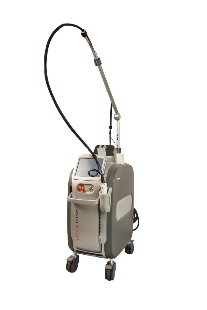 Il DermaV di Lutronic è un laser dermatologico avanzato multiuso che utilizza lunghezze d’onda di 532 nm (KTP) e 1064 nm (Nd:YAG) per trattare efficacemente lesioni vascolari e pigmentate, come macchie rosse, vene varicose, rosacea, macchie solari,